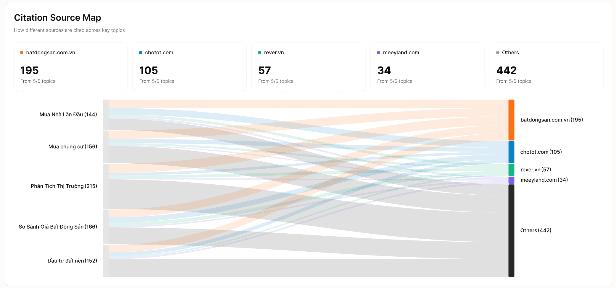 The Citation Source Map also tells you how much citation volume flows to sources outside your tracked competitors. In the example here, "Others" accounts for the largest share of citations across all five topics. That is the share of citations going to domains you haven't identified or aren't tracking yet. If that band is large relative to your own, it is worth opening the Citations tab to identify which domains are inside it.