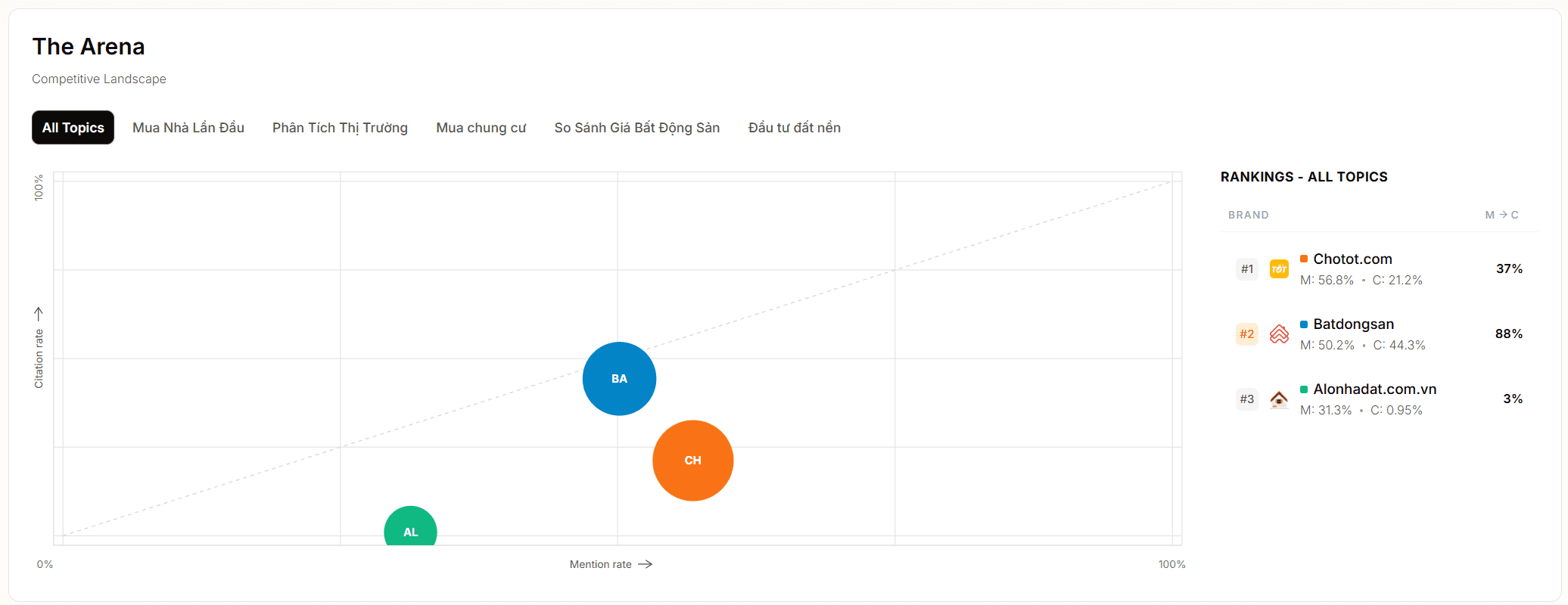 Check The Arena for each topic separately. A brand that appears to trail you in the All Topics view may be dominant in a single topic cluster that matters to your pipeline.
