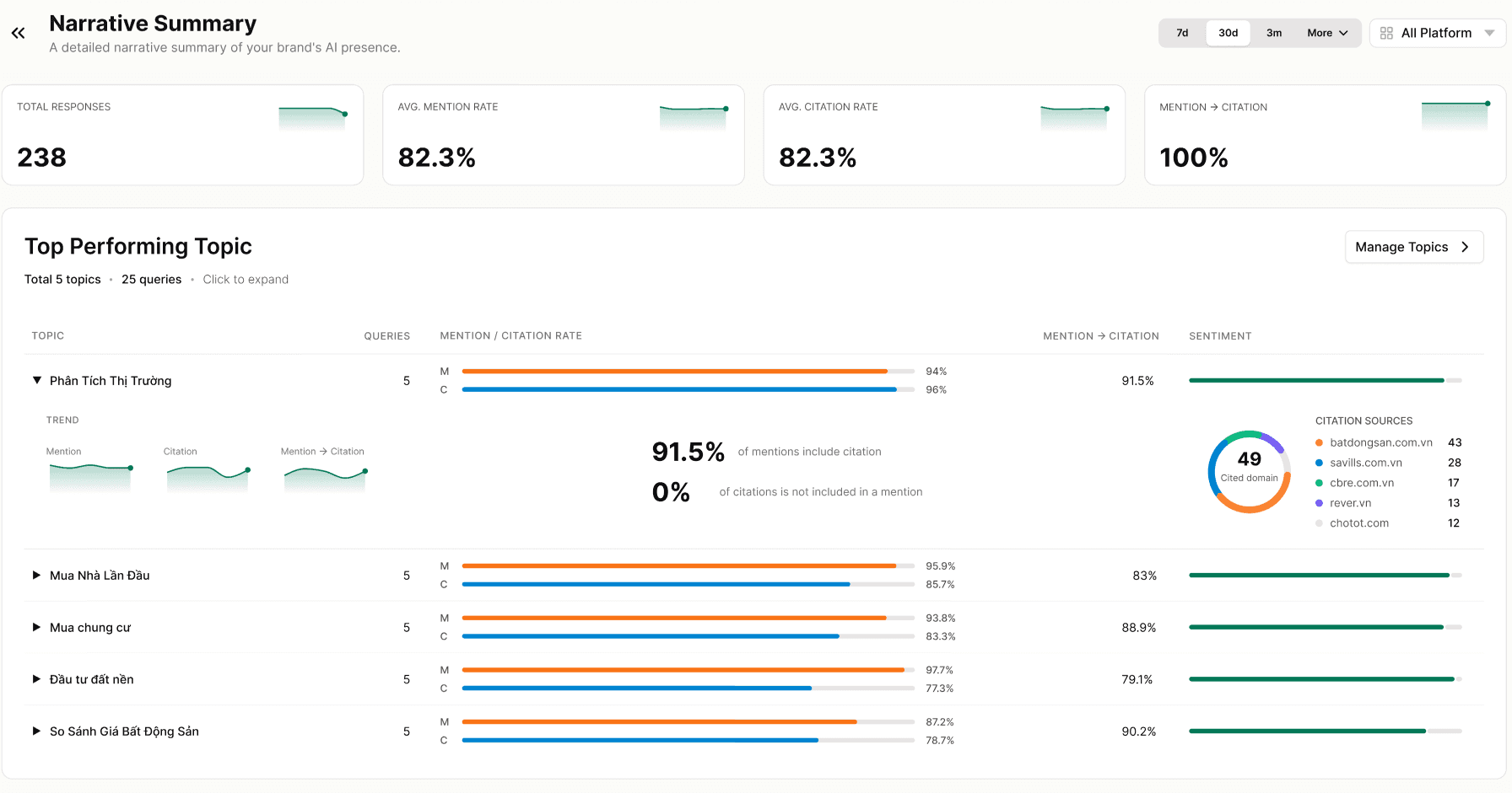 Below the header metrics, the Top Performing Topic section lists all your tracked topics in one expandable table. This is the Narrative Summary's primary diagnostic surface.