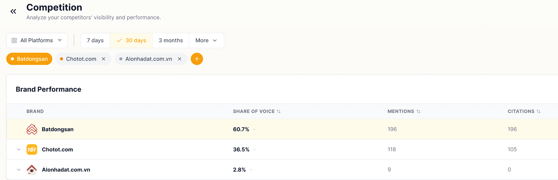 The Brand Performance table is the first thing you see. It lists every tracked competitor with their Share of Voice, Mentions, and Citations side by side.