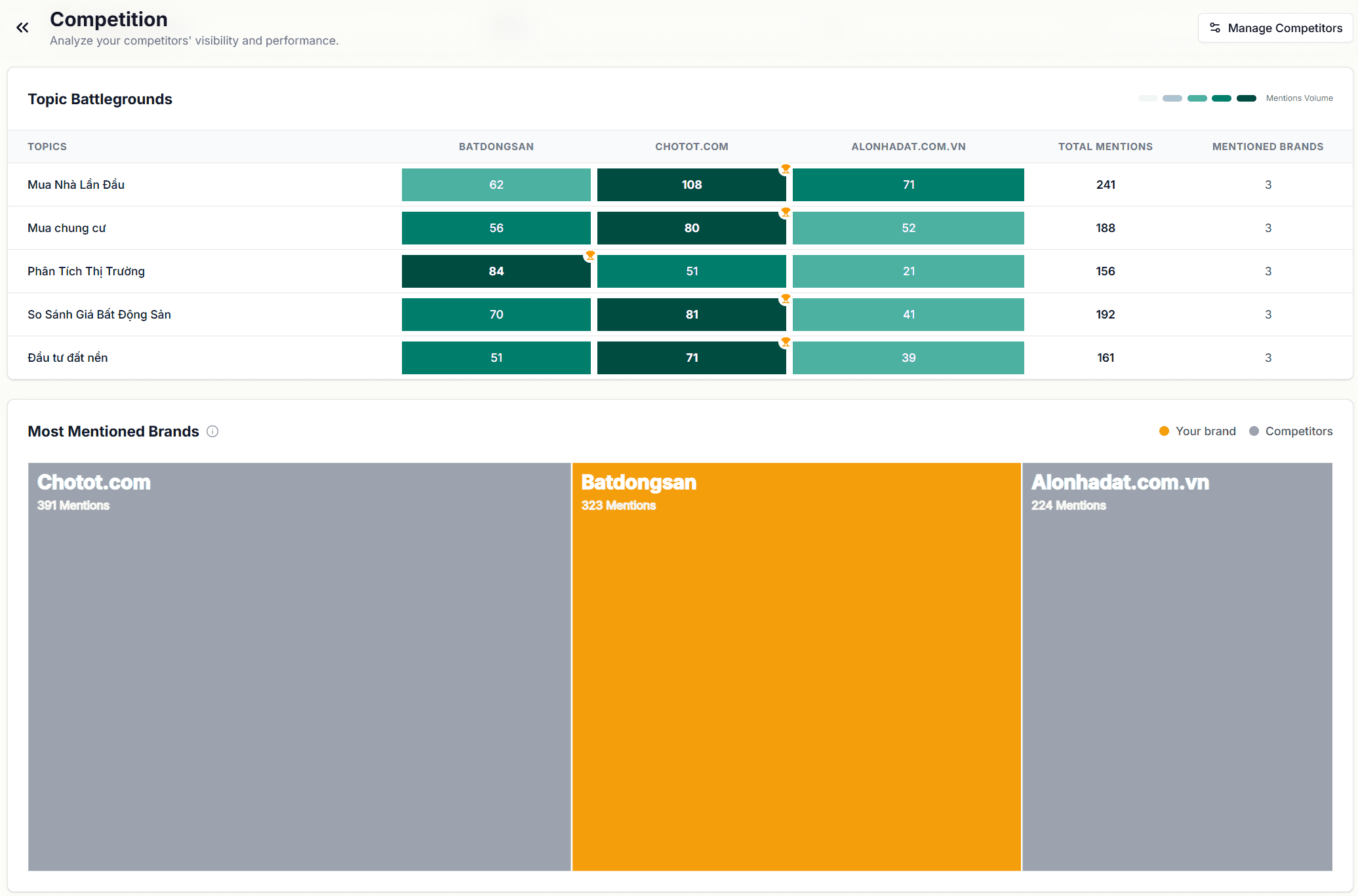 The Competition module has three sections: Brand Performance, Topic Battlegrounds, and Most Mentioned Brands. Each one answers a different competitive question.