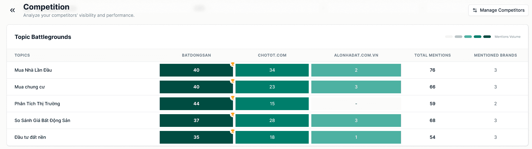 Move to Topic Battlegrounds and filter to the topics that matter most to your pipeline. Find where that competitor's mention count is closest to yours. Those are the specific topic clusters where you are competing for the same citation slots.