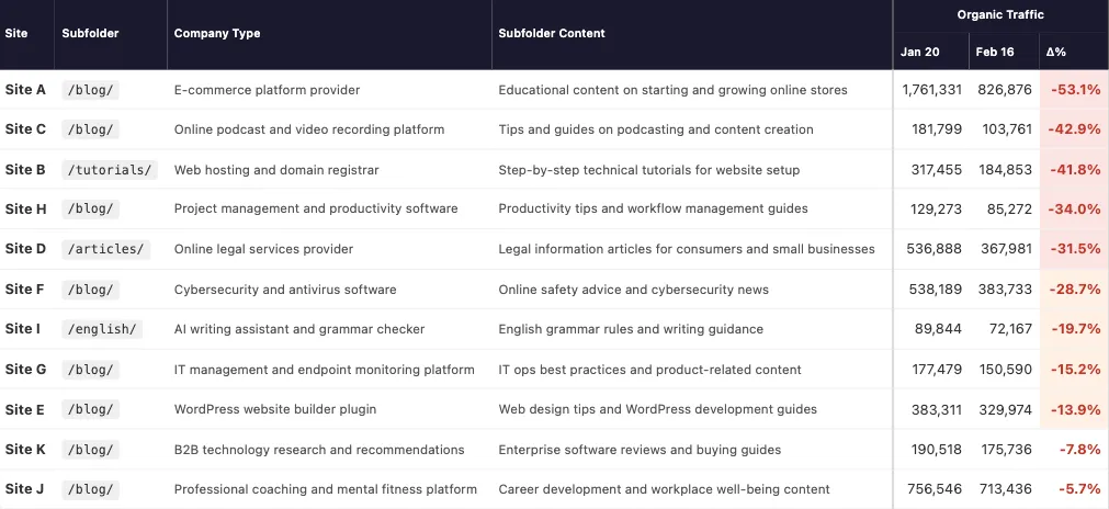 Google Gemini (Moderate): Experienced declines across 10 of the 11 sites, but the drops were less severe than AI Mode, suggesting reliance on a broader or cached knowledge base.
